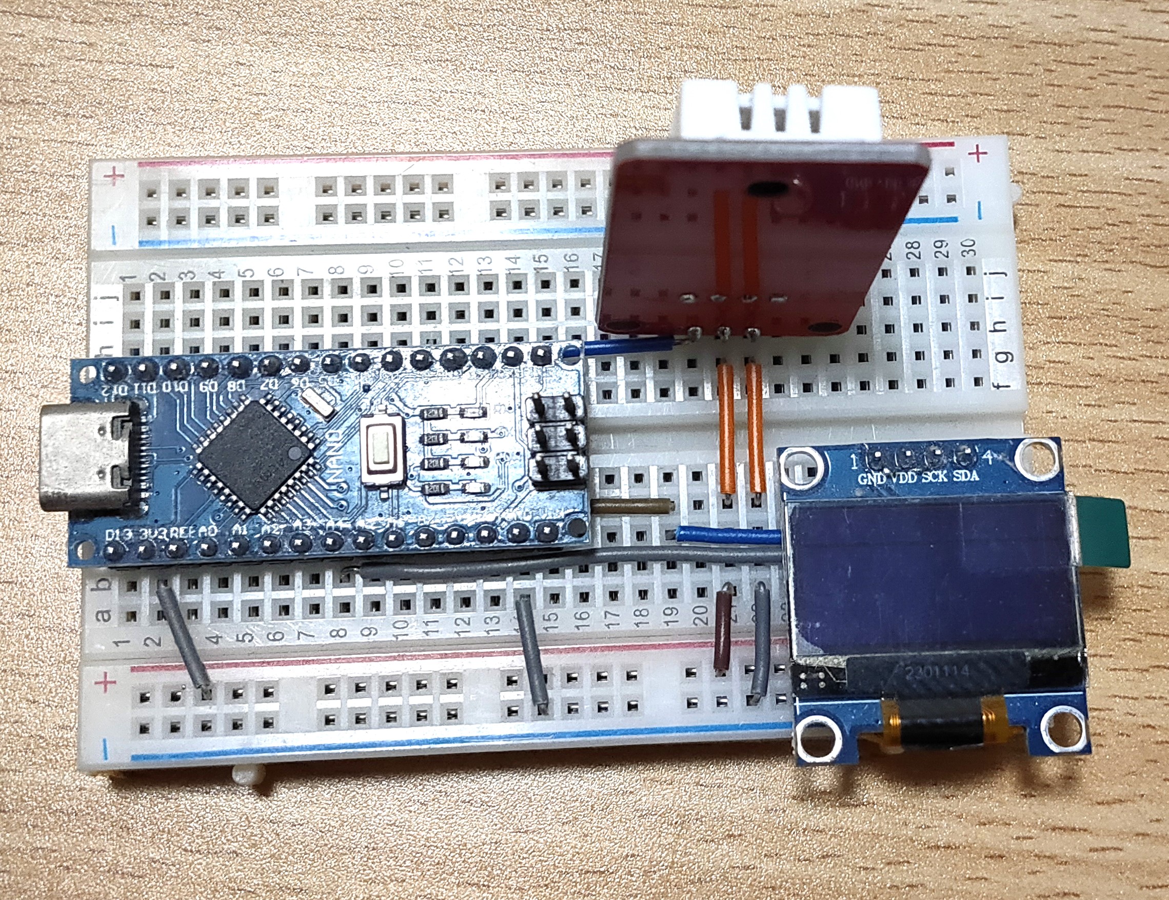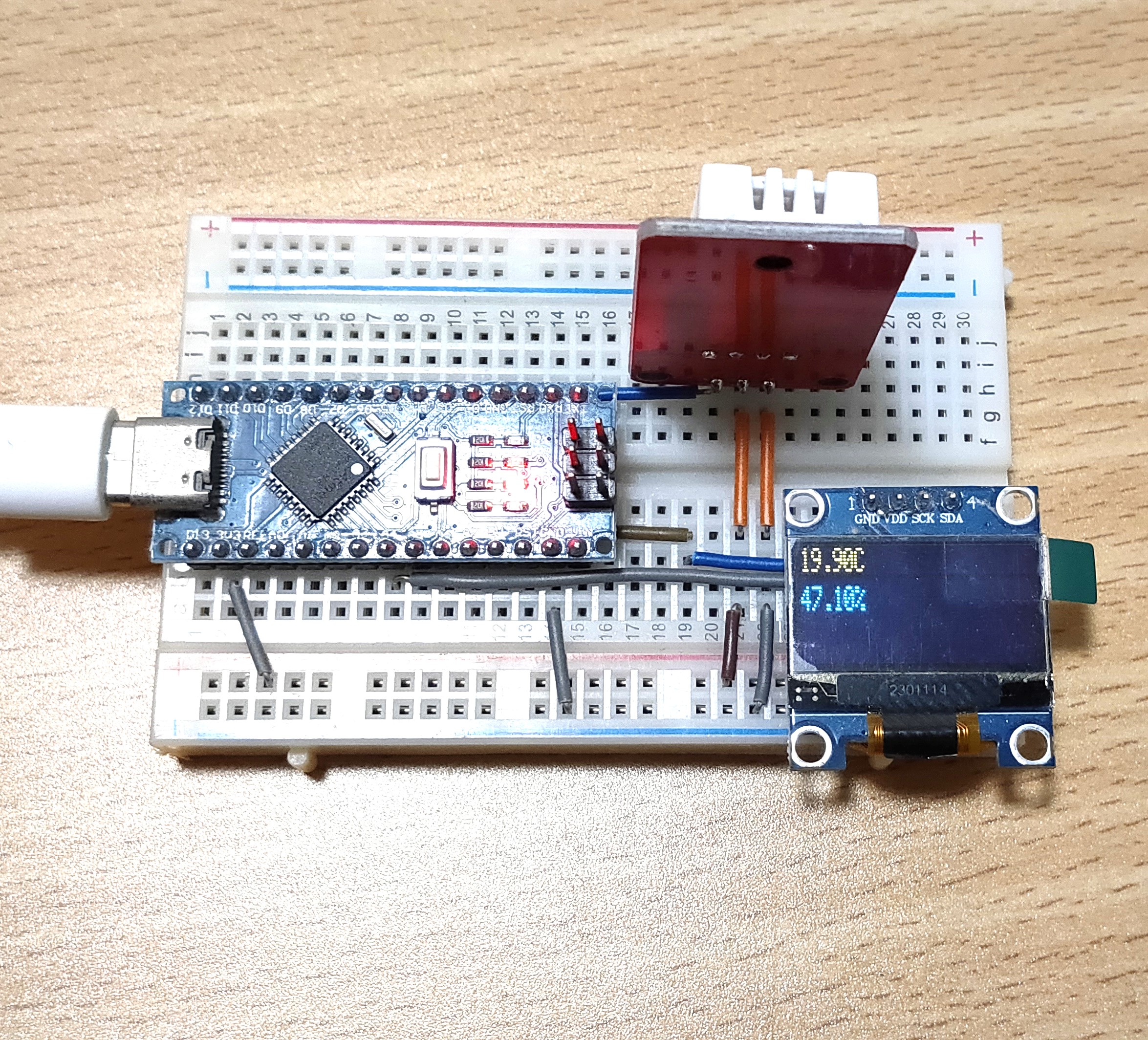 Nano、温湿度センサー(DHT22)、ディスプレイを差していきます。