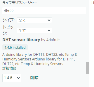 今回は「#include <DHT_U.h>」を読み込むために、「DHT sensor library」をインストールします。